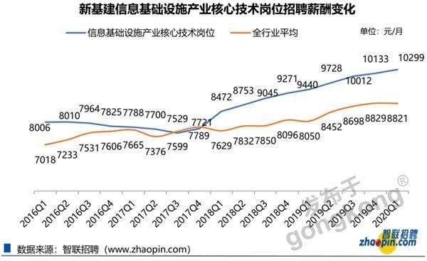 2020年一季度,信息基础设施产业核心技术岗位的平均招聘薪酬为10299/月,比全行业平均(8821/月)高16.75%5G 及人工智能岗位薪资更优。信息科学技术、计算机科学与技术专业毕业生当前收入最高,在万元以上。
